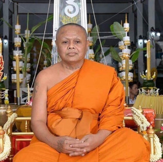 มือขวาบนชี้นำทางสว่างสู่ความสำเร็จสมปรารถนาทุกประการ ชุดทรงประดับไปด้วยลายผ้ามอญ ซึ่งเป็นเอกลักษณ์ ค่ะ ยันต์ที่ฐานเขียนโดยท่านเจ้าคุณหมูใส่เป็นโลโก้ เพื่อแก่การระลึกถึงท่าน